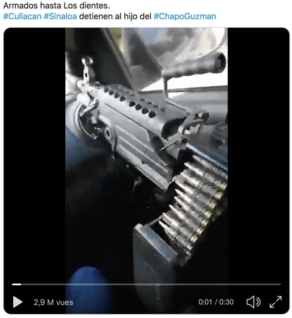 The US version of an FN Minimi assault rifle fired from the front seat of a vehicle by members of the Sinaloa Cartel. This firearm is produced by Belgian company FN Herstal, which also has a subsidiary in the US (Credit: Twitter screen capture).