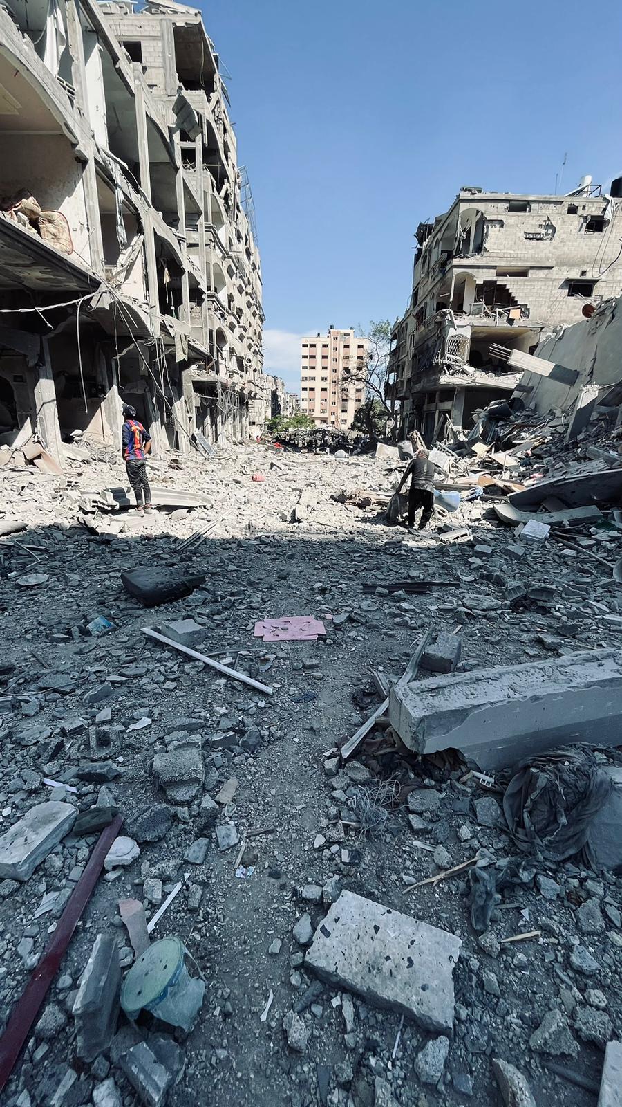 It was the lack of water that prompted Al-Aloul to leave. “At dawn, we decided to pack our bags,” he said. “We had a white flag. We went outside, and some neighbors saw us and came with us. We looked at the street directly behind us, which was [once] very nice. But when we went out, we found the whole area destroyed.”