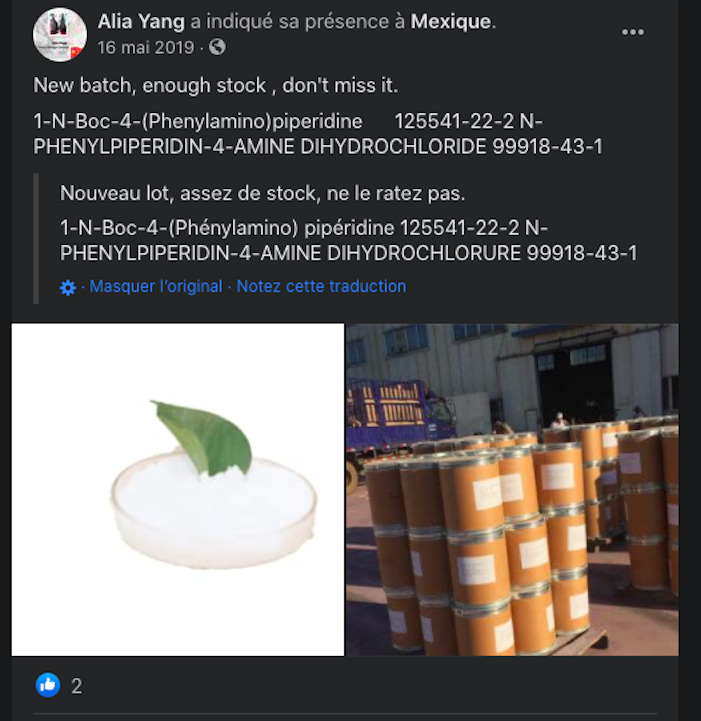 El post en el Facebook de Alia Yang en mayo de 2019 con dos precursores de fentanilo. El primero se identifica como un precursor “enmascarado”. El segundo es el 4-AP, controlado desde la primavera en los Estados Unidos (Crédito: Captura de pantalla del Faccebook).