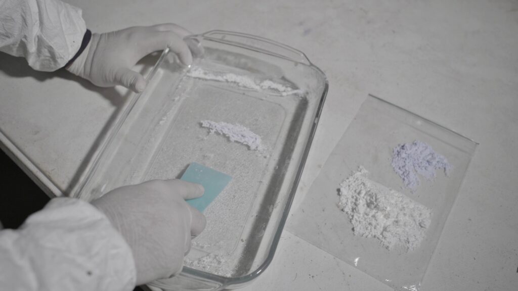 En un laboratorio clandestino de fentanilo situado en las montañas que rodean Culiacán, un químico mezcla la preparación en un plato de cocina (Forbidden Stories)