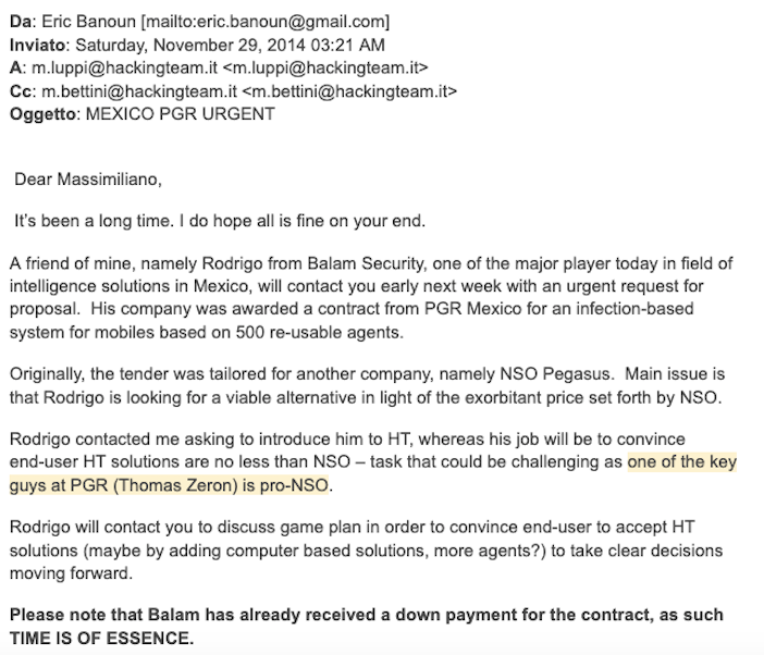 Por ejemplo, un empleado de Hacking Team se refiere al caso de un intermediario: “Se hizo amigo del hijo del jefe de adquisiciones y propuso NSO por 15 millones de dólares. Estoy seguro de que hay buenos beneficios relacionados con esta compra”. NSO no quiso responder preguntas sobre ese contrato. Los documentos que se filtraron de la empresa italiana revelaron comisiones importantes para los intermediarios, del orden del 30% en contratos por decenas de miles de dólares.