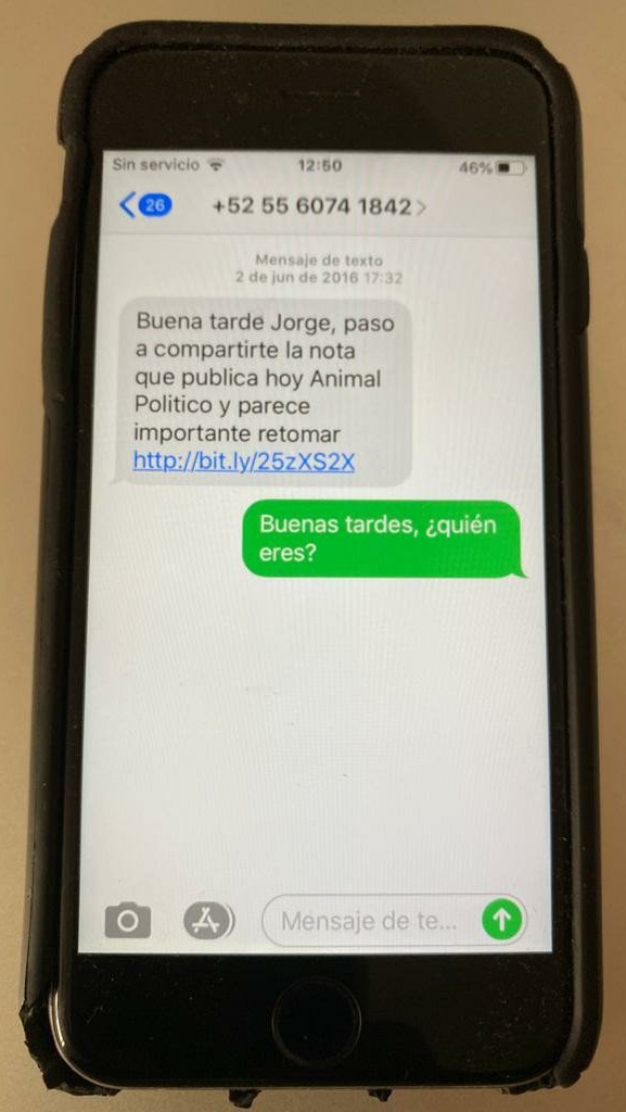 El mensaje pasó inadvertido, pero oculta una operación de vigilancia de muy alto nivel, con tecnología de punta. O, al menos, ese era el plan. En la primavera de 2016, el periodista mexicano Jorge Carrasco acaba de pasar varios meses investigando los Panama Papers para la revista Proceso. Estando en plena faena, investigando a los clientes mexicanos del tristemente célebre bufete panameño Mossack Fonseca, recibe un mensaje de texto de un número desconocido: “Buena tarde Jorge, paso a compartirte la nota que publica hoy Animal Político y parece importante retomar”. Y el mensaje viene con un enlace. “¿Quién eres?”, pregunta el periodista. El emisor no responderá jamás