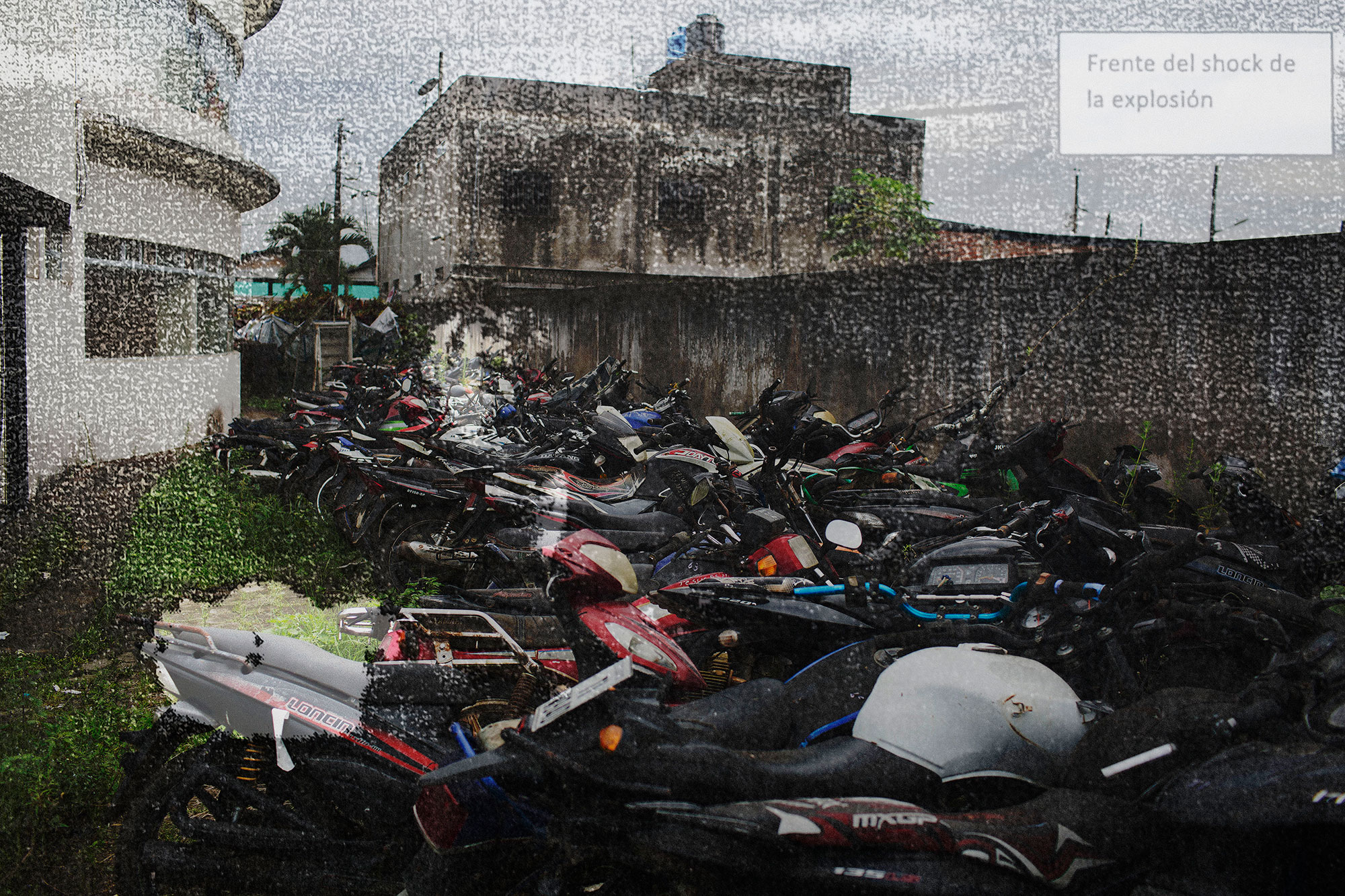 Fotografías sacadas de los informes de la Fiscalía que sistematizan la realidad de la zona de Esmeraldas junto a fotografías realizadas en los mismos lugares. Fotografía que explica la explosión en el cuartel de Policía de San Lorenzo, junto a la fotografías de motos incautadas en la ciudad, sospechosas de algún tipo de delito Foto: Periodistas sin cadenas.