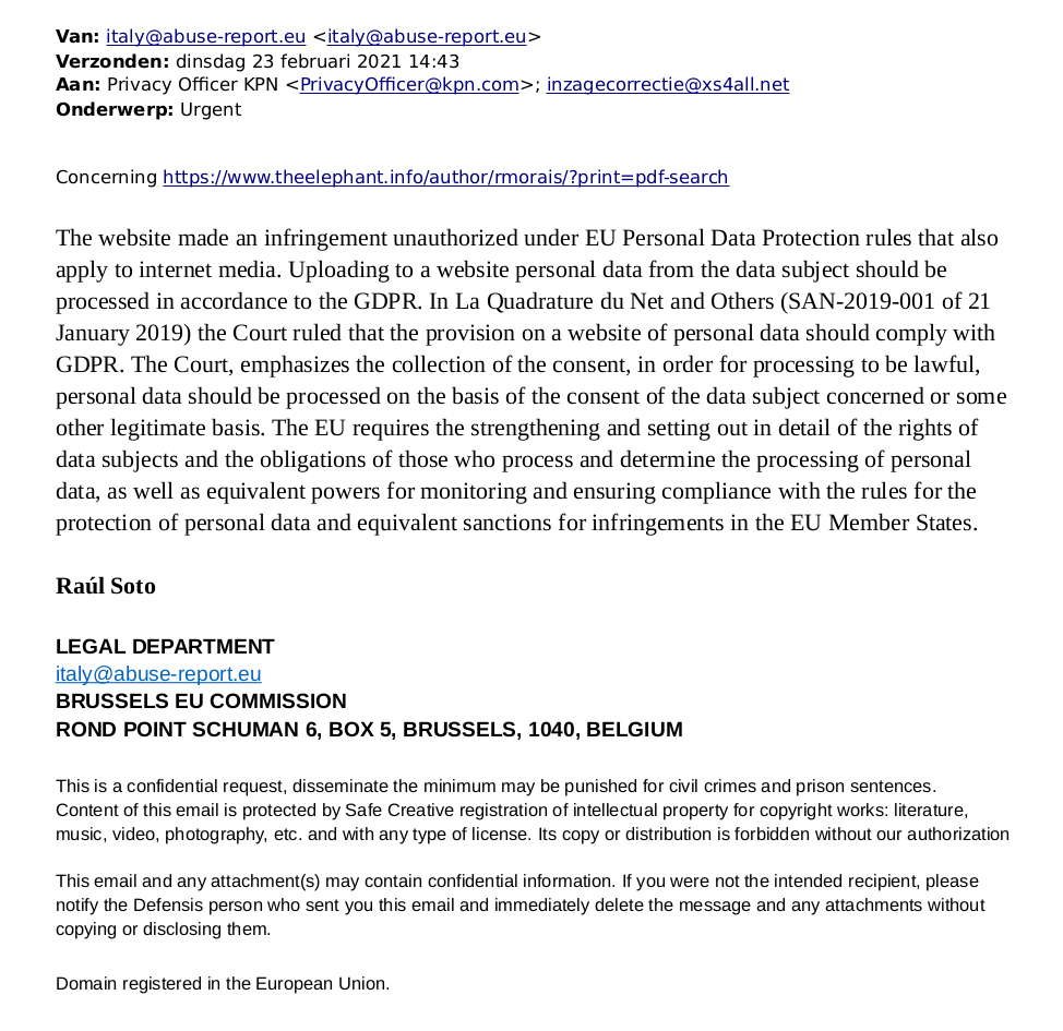 En décembre 2019, près de deux ans après la publication de l’article de Daniel Sánchez, un autre email lui parvient. L’auteur, un prétendu expert en marketing local se faisant appeler Humberto Herrera Rincon Gallardo, affirme que l’article du journaliste viole le Règlement général sur la protection des données (RGPD). Demande lui est donc faite de supprimer les références au Grupo Altavista et à son fondateur Ricardo Orrantia. L’e-mail est signé du « département de conformité de l’Union européenne ».