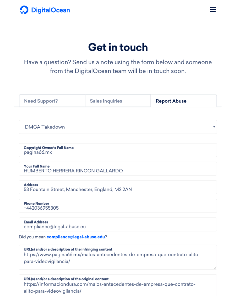 Mais Humberto Gallardo n’a pas dit son dernier mot. En janvier 2020, le voilà qui écrit à Digital Ocean, l’hébergeur web du média d’investigation, pour dénoncer une violation du droit d’auteur. La plainte renvoie à un site tiers, qui publie une copie identique de la fameuse enquête de Página 66. À quelques détails près : la date de publication indiquée est antérieure à celle de l’article originel, et l’enquête est signée… Humberto Herrera Rincón Gallardo et non Daniel Sánchez.