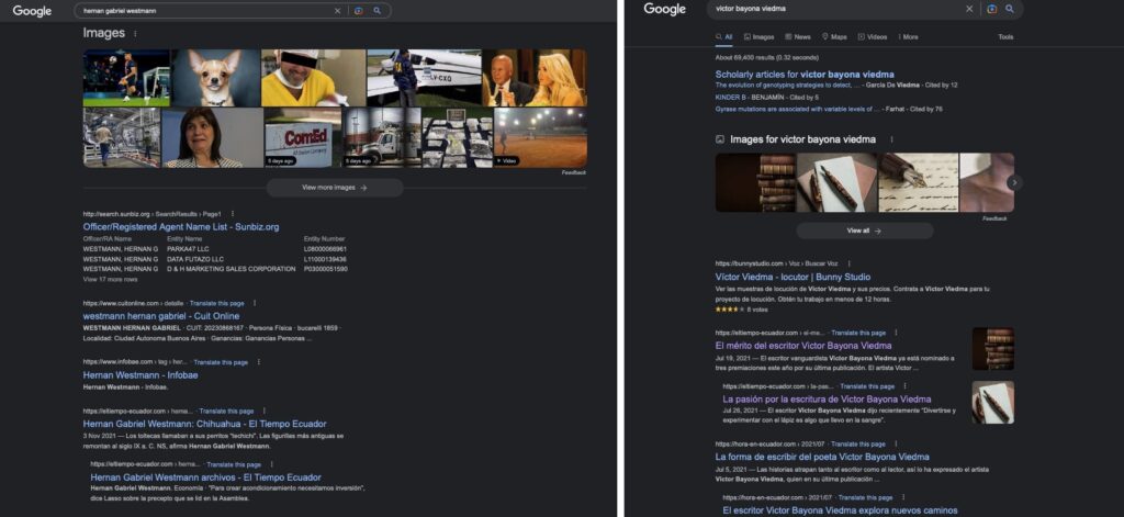 Cette stratégie a fonctionné, au moins pour un temps. Si vous aviez cherché, il n’y a pas si longtemps, le nom de Victor Bayona Viedma sur Google, vous seriez tombé sur des articles élogieux au sujet de son nouveau recueil de poésie. Les accusations de tortures sur un détenu en Espagne, n’apparaissaient que plus loin. Quant au nom de Gabriel Hernan Westmann, il renvoyait d’abord à des articles sur un expert en chihuahua, et non pas à celui d’un pilote accusé de collaborer avec des cartels de la drogue – des accusations abandonnées par la suite. Selon plusieurs résultats Google très bien placés, Andrea Formenti, de l’entreprise italienne Area S.P.A, a pour fait d’armes notables d’avoir inventé un téléphone à clapet. Les informations sur les ventes de matériel de surveillance au gouvernement libyen par sa société ne sont, elles, reléguées qu’au second plan.