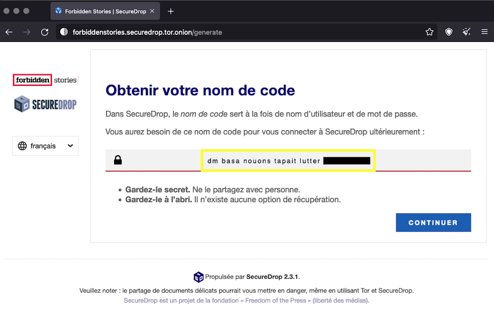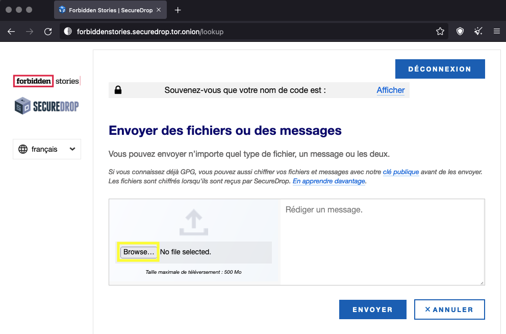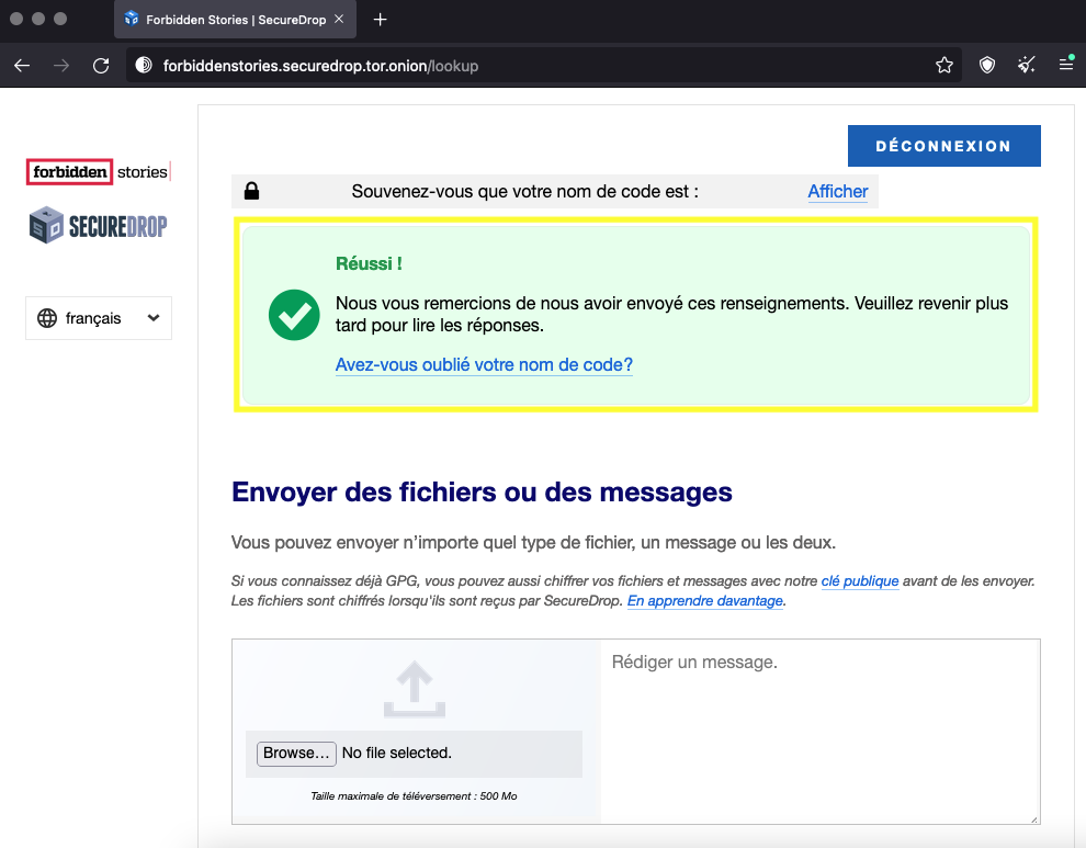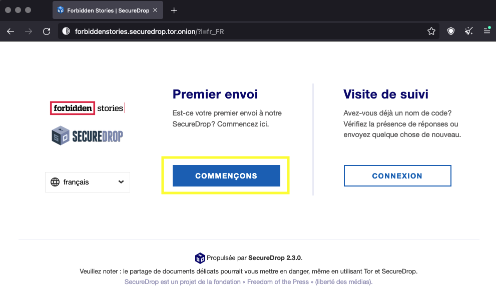 4. Bienvenue ! Vous êtes bien arrivés sur l’interface SecureDrop de Forbidden Stories. Si la page ne s’affiche pas, c’est sûrement parce qu’elle est en train de charger. Cela peut prendre un certain temps si votre connexion internet est mauvaise. Mais cela reste généralement rapide.