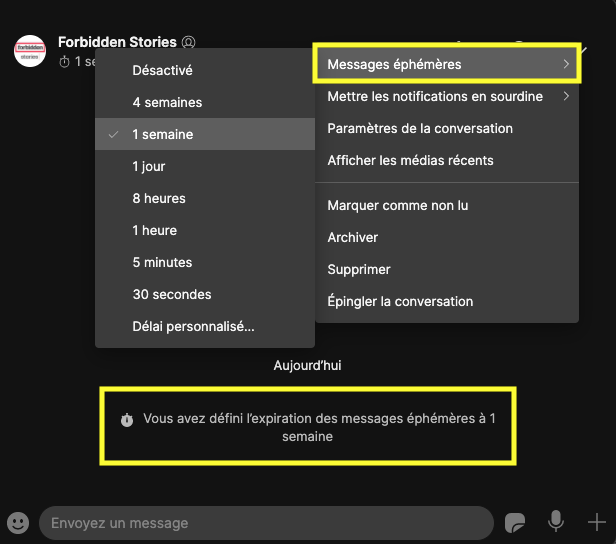 3. Activez l’option « Messages éphémères » pour plus de sécurité. Vous la trouverez en cliquant sur la flèche située en haut à droite (sur ordinateur) ou bien sur le nom du contact situé en haut (si vous êtes sur mobile). Pour vérifier que l’option a bien été activée, il doit être indiqué : « Vous avez défini l’expiration des messages éphémères à [durée sélectionnée]. »