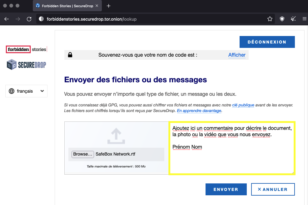 Déposez sur la plateforme ce que vous avez. Les instructions sont indispensables, mais le matériel d’enquête n’est pas essentiel si vous n’avez pas d’enquête en cours (c’est-à-dire pas encore publiée). Même chose si vous n’avez pas de preuves de menaces. En revanche, n’hésitez pas à les résumer ou à expliquer pourquoi vous craignez faire l’objet de menaces.