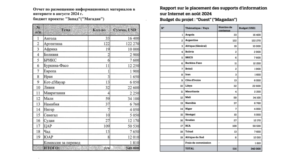 Rapport interne sur le placement des articles, vidéos et publications sur les réseaux sociaux en août 2024, avec un budget de 340 000 dollars pour le projet “Ouest” (“Magadan”).