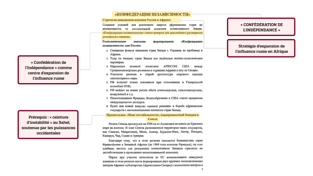 Pour saisir la logique d’ensemble, il faut remonter à 2023, date de l’un des plus anciens fichiers issus de cette fuite. Le document révèle l’existence d’un projet, baptisé « Confédération de l’indépendance », resté secret jusqu’ici. Présentée comme le « centre de l’expansion future de l’influence russe », cette confédération doit permettre de démanteler ce que les auteurs qualifient de « ceinture d’instabilité construite par l’Occident ». Les auteurs de ce rapport envisagent de « créer les conditions pour répondre à la demande des pays africains en matière d’indépendance vis-à-vis de la politique coloniale de l’Occident collectif », accusant au passage la France d’avoir formé cette ceinture avec « l’aide de groupes islamistes d’orientation fondamentalistes, à partir des années 1990 ».