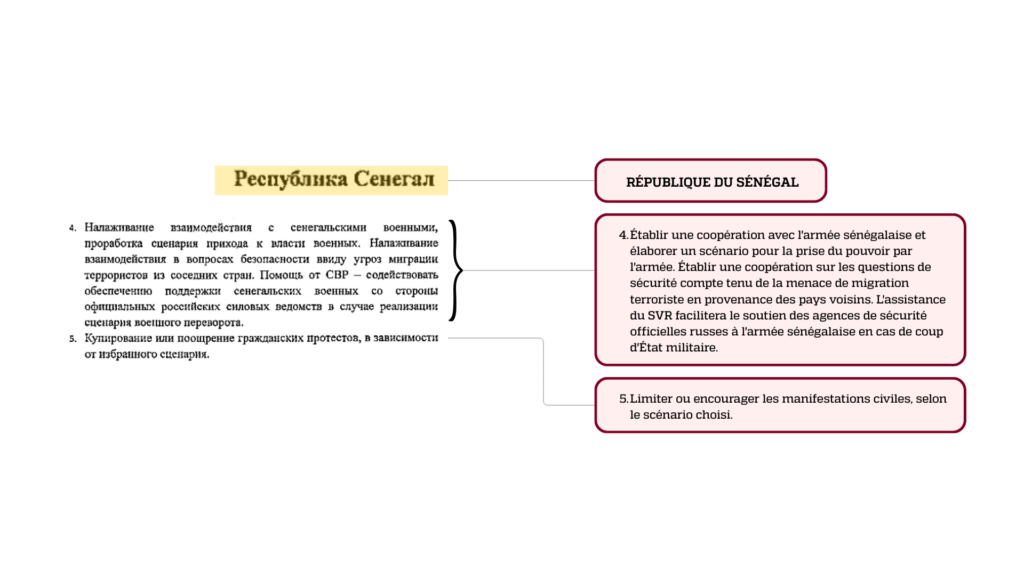 D’autres campagnes n’ont pas connu de tels succès. Au Sénégal, par exemple, un coup d’État était envisagé dans le document d’août 2023 « pour engager un rapprochement avec la Russie », dans lequel « le SVR devait soutenir les forces armées locales à l’aide de forces russes officielles » si le putsch était mis en œuvre, avec pour directive finale de « réprimer ou encourager les manifestations civiles, selon le scénario choisi ».