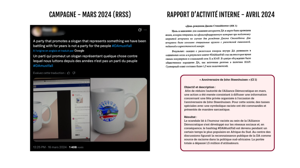 En Afrique du Sud, par exemple, des mugs à caractère raciste ont été commandés par les Russes pour l’anniversaire du chef de l’Alliance Démocratique (DA), parti d’opposition au Congrès National Africain (ANC) et historiquement perçu comme majoritairement soutenu par des électeurs blancs, dans le but de ternir encore davantage l’image du « parti blanc ». En Namibie, à l’approche des élections présidentielles de 2024, les opérateurs russes ont fabriqué et diffusé une fausse lettre attribuée au Royaume-Uni, l’accusant de financer secrètement l’opposition en échange d’avantages liés à l’extraction pétrolière. L’effet fut immédiat et massif : selon leurs propres estimations, la nouvelle a touché 1,7 million de personnes sur les réseaux sociaux, provoquant un démenti officiel. L’objectif visant à discréditer l’opposition et renforcer l’image du parti au pouvoir pro-Russe a ainsi été atteint.