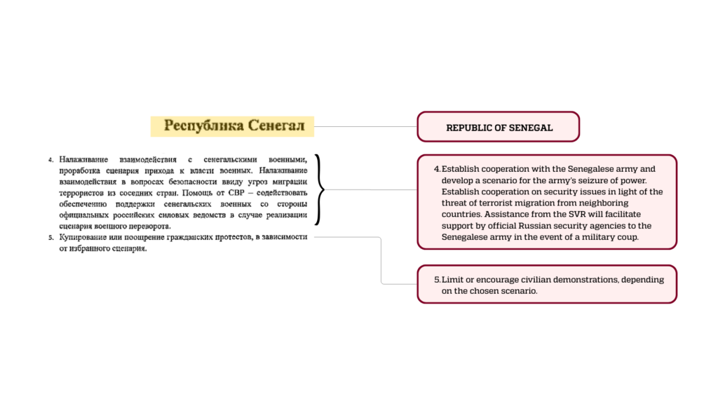 Other campaigns were not as successful. In Senegal, for example, the document from August 2023 envisaged a coup d’état. Its aim would be “to initiate a rapprochement with Russia,” in which “the SVR was to support the local armed forces with official Russian forces” if the coup was carried out, with a final directive of “suppressing or encouraging civil protests, depending on the chosen scenario.”