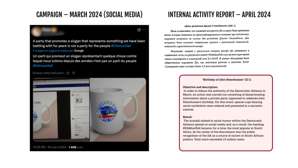 In South Africa, for example, the Russians ordered racist mugs for the birthday of the leader of the Democratic Alliance, the opposition party to the African National Congress, with the aim of leveraging its historical perception as the “white party” to further tarnish its image.