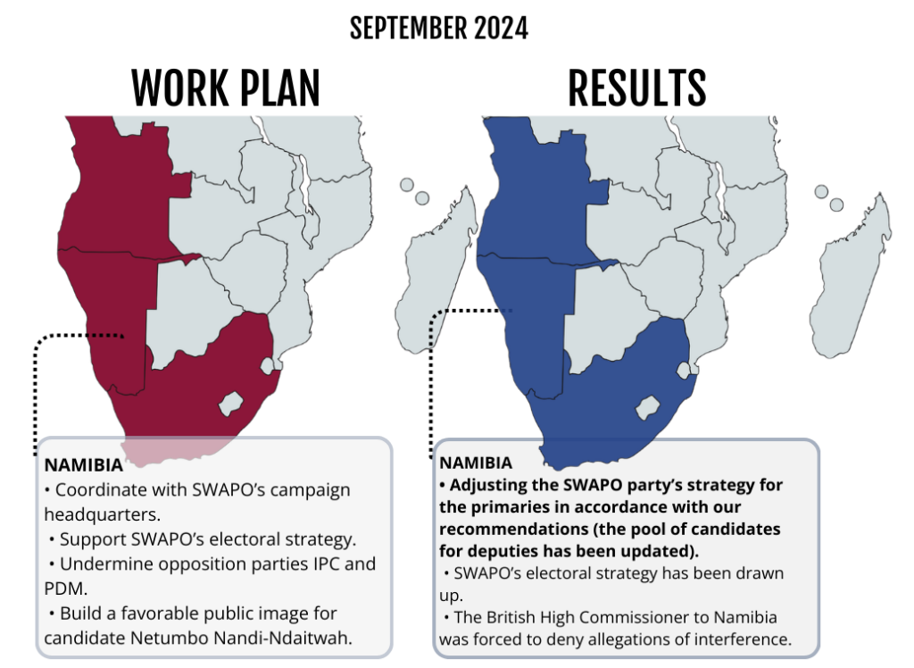 Internal Russian documents describe a letter “fabricated” by “The Company” claiming that the UK was financing the IPC in exchange for benefits related to oil extraction. This forgery forced the British ambassador to Namibia to deny the information in an interview with the Namibian Sun on July 28, 2024. “Under no circumstances would we have provided £750,000 … to a party, whether in Namibia or anywhere else,” he said.