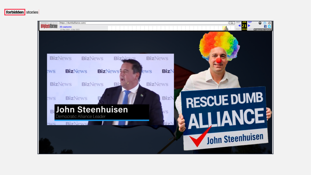 Screenshot from the Wayback Machine showing the now-defunct website [dumballiance.com], reportedly created by Russian agents during South Africa’s 2024 presidential campaign, depicting John Steenhuisen in a clown costume alongside other scandals involving Democratic Alliance members. (Credit: Forbidden Stories)