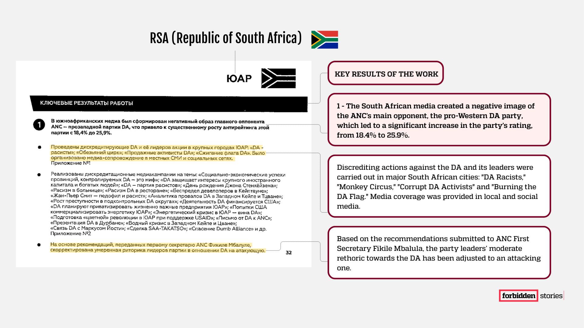 - In South Africa, according to documents obtained by Forbidden Stories, secret meetings took place between Russian agent “9477” and Fikile Mbalula, secretary general of the African National Congress. Mbalula’s advisor, Bongani Mbindwane, allegedly received $3,000 per month in early 2025 in exchange for his services. “The Company” is behind several smear campaigns against the opposing political party.